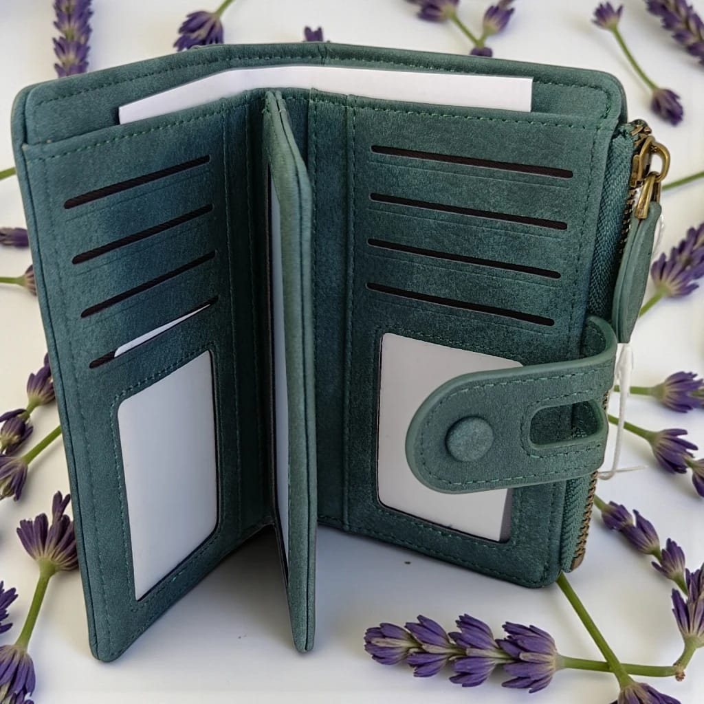 Cartera monedero verde tipo antelina con bordado y tarjetero. Compacta, organizada y fácil de combinar.
